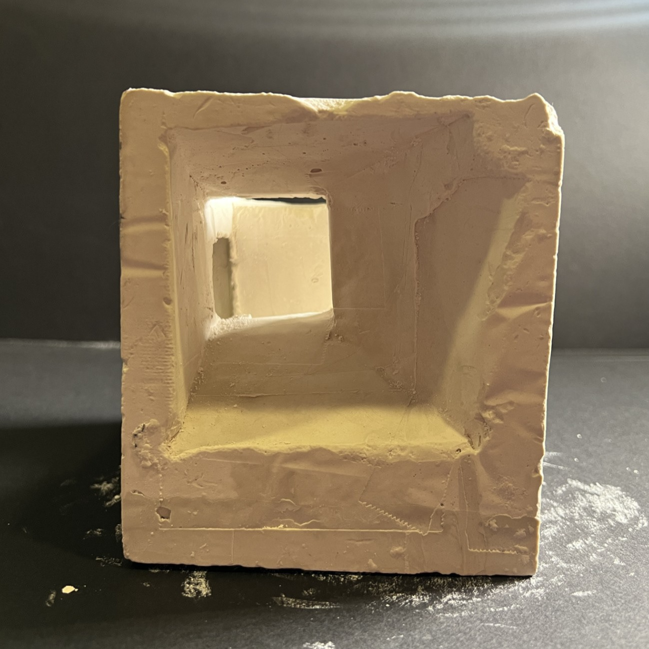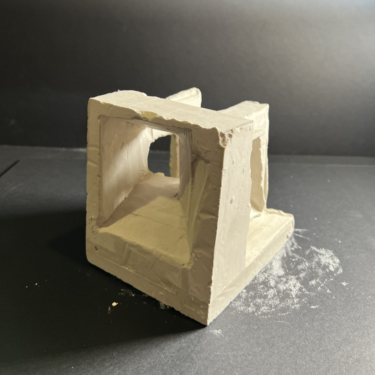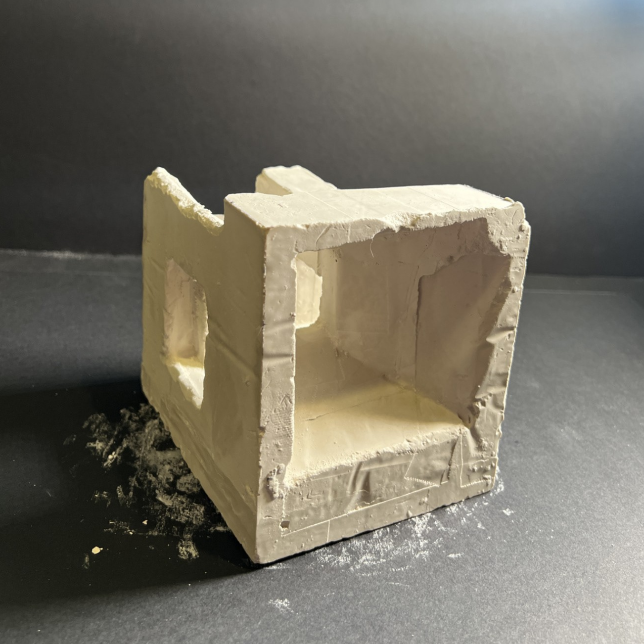 A plaster model representing the story of my interviewee, showcasing different pathways that create a sense of feeling lost. I intentionally added numerous openings and angled planes to affect the light that entered the space as well as tapered openings to represent the feeling of being small in a big space.