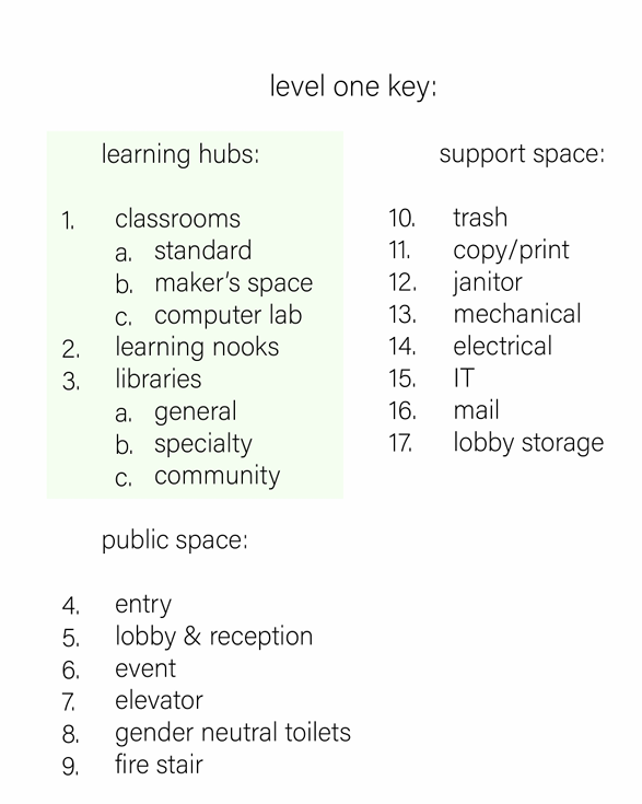 RIDGE at its core is dedicated to providing educational opportunities for immigrants old and new. Wayfinding techniques are used throughout the building to guide habitants to these learning centers comprised of learning hubs, libraries, classrooms, a computer lab, and a maker's space.